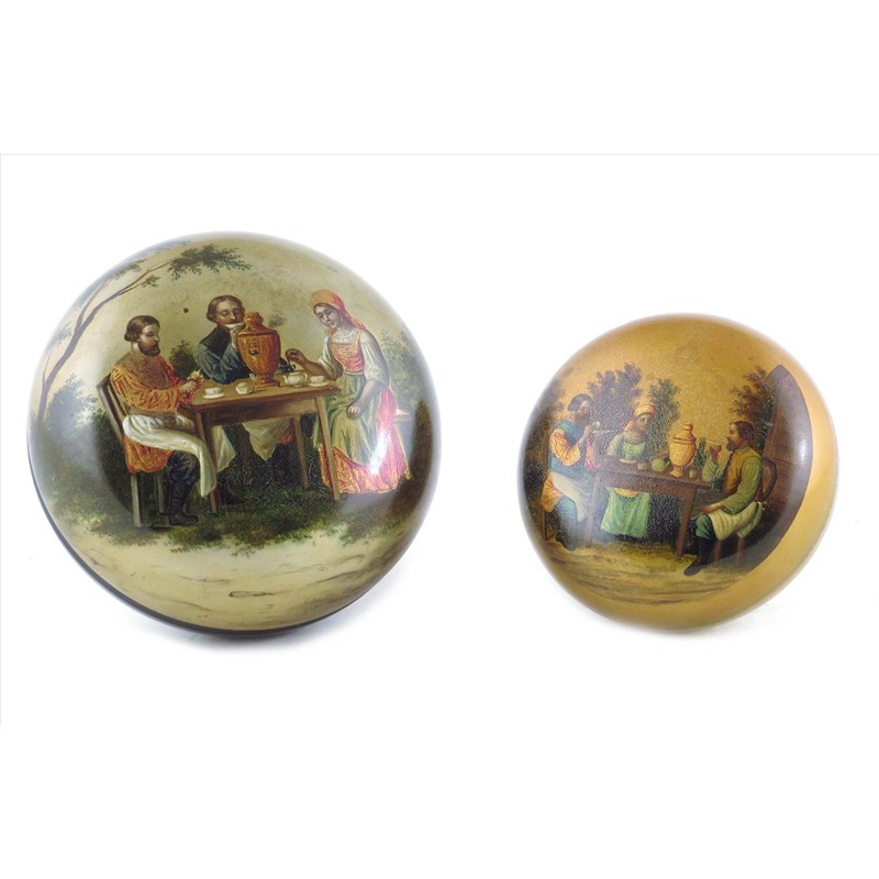 Two late 19th century Russian lacquer circular boxes, the lids painted with people taking tea, the interior of one with a gilt medallion mark the other with an inscription 'MYKYTHHA', 4¾in (12cm) diameter, max. (2)
