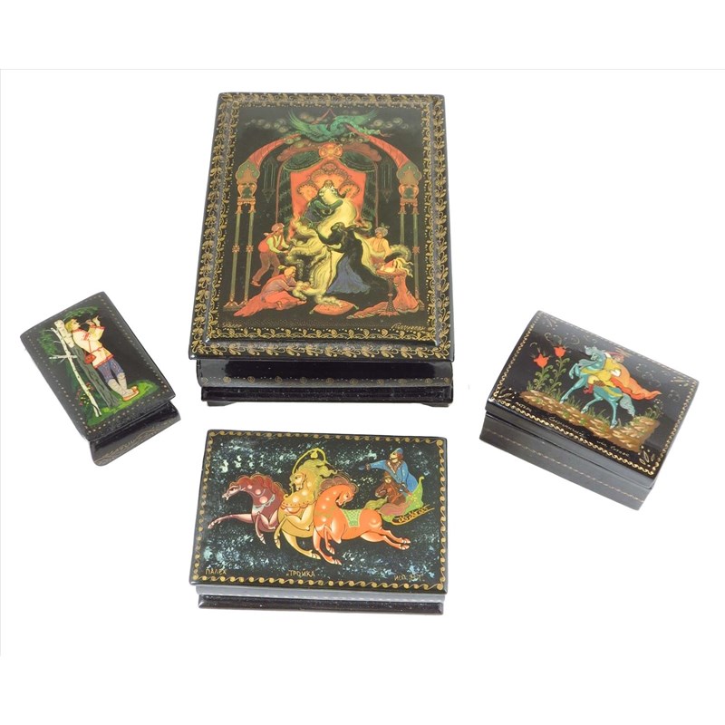 Four modern Russian lacquer boxes, decorated with fairy tale figures / scenes, three inscribed, one with a signature, 5¾in (14.4cm) wide, max. (4)