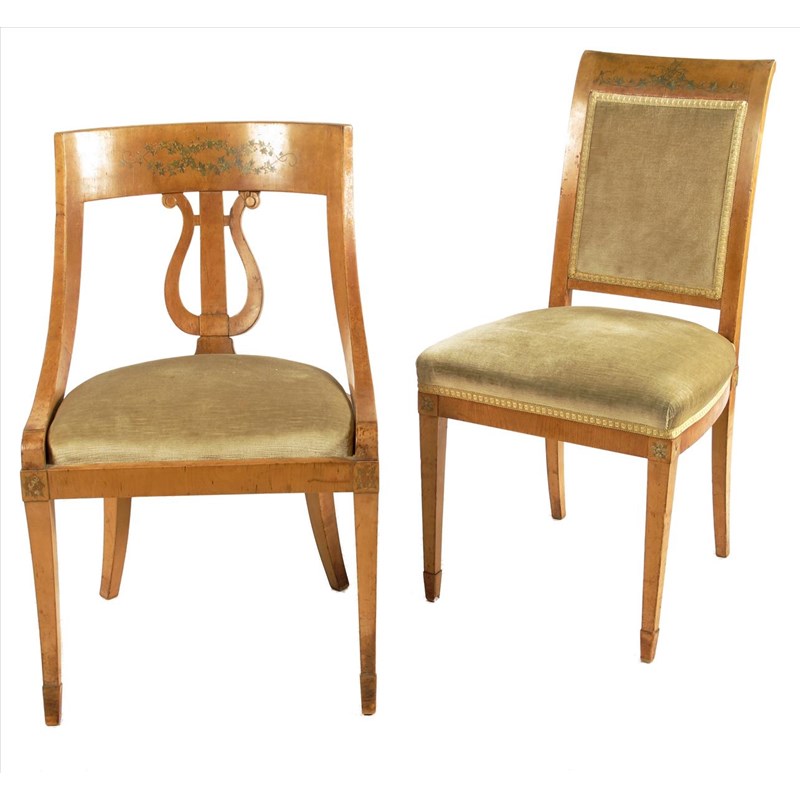 Three German painted satinwood panel back side chairs by Kimbel & Friederichsen, and a side chair with lyre splat back. (4)