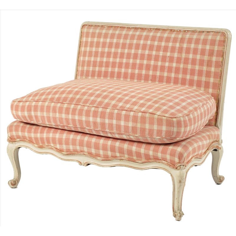 A French cream painted wood moulded frame low settee, with a squab cushion, 26in (66cm) high, 33in (84cm) wide, 20in (51cm) deep.