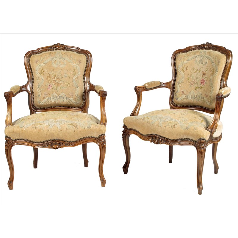 A pair of Louis XV style carved walnut fauteuil, with ribbon tied floral needlework covers. (2)