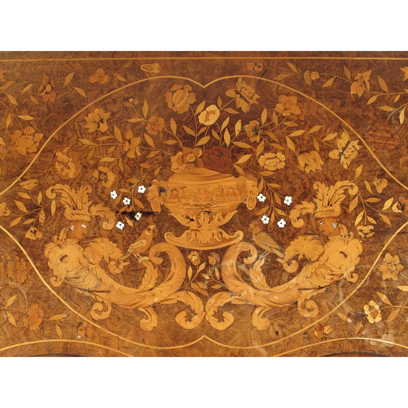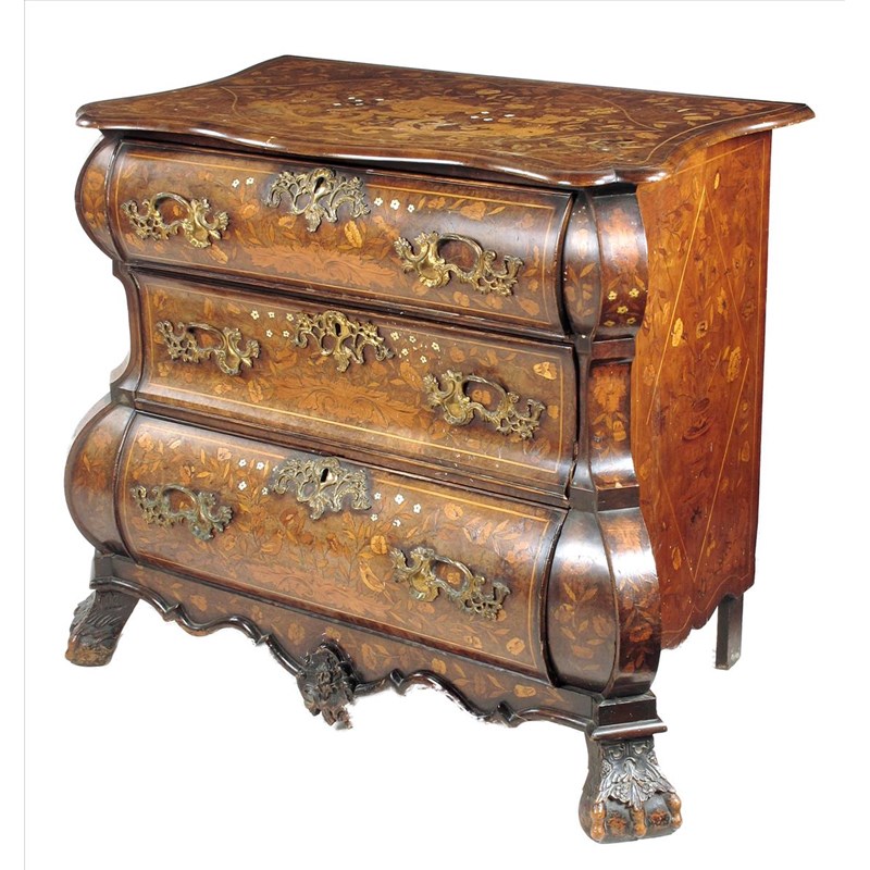 An 18th century Dutch walnut and marquetry bombe commode, inlaid with various fruitwoods, mother of pearl and bone, urns of flowers, birds, mythical beasts, with three drawers fitted gilt brass handles on carved feet, 33in (84cm) high, 39in (99cm) wide, 22½in (57cm) deep.