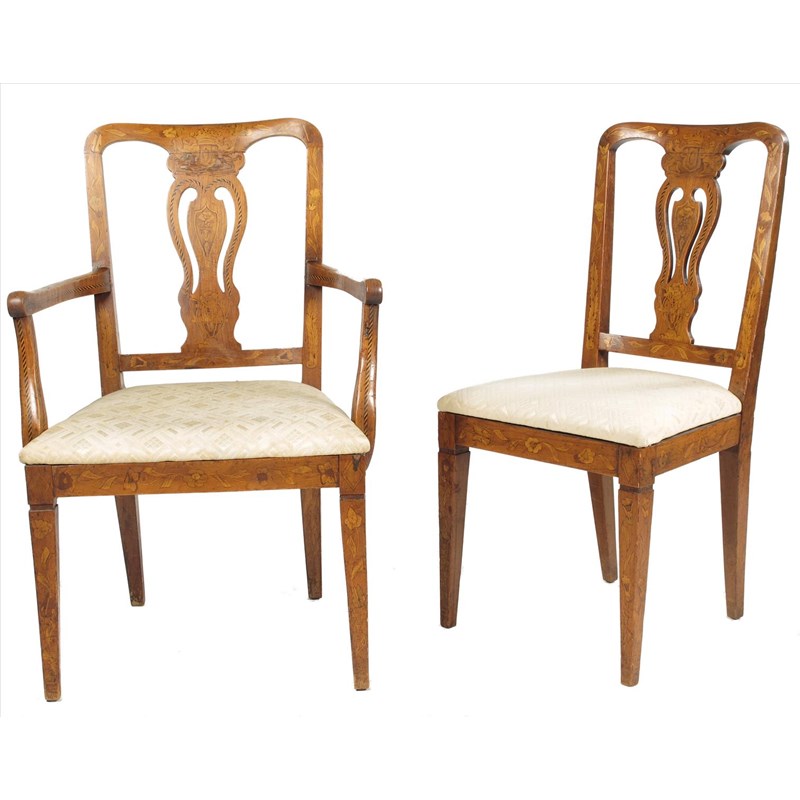 A set of six early 19th century Dutch marquetry dining chairs, with vase shape splats, with a crest above, comprising: an open armchair and five side. (6)