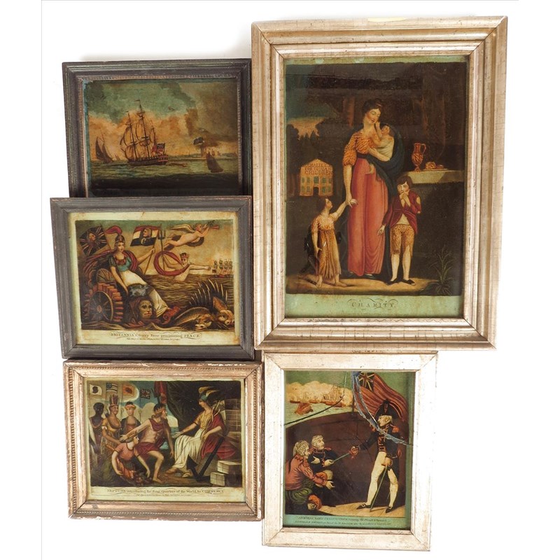 Five late 18th / early 19th century reverse glass pictures, 'NEPTUNE introducing the Four Quarters of the World to COMMERCE', 'Pub. March 14, 1803 by I. Hinton 44, Wells Strt. Oxford Strt. London.' 7¼ x 9¼in (18.4 x 23.4cm); 'The ACTIVE PRIVATEER pafsing TILBURY with a FRESH BREEZE', 'Published March 19th 1796, by Haines & Son. Rolls Buildings London'; 'BRITANNIA'S Glory Fame proclaiming PEACE' 'Pub. March 14, 1803, by. I. Hinton, 44, Wells Strt. Oxford Strt. London.'; 'CHARITY', 'Published Sep. 1. 1804, by I. Hinton, 44, Wells Strt. Oxford Strt.'; 'ADMIRAL LORD COLLINGWOOD, receiving the French & Spanish ADMIRALS SWORDS. on Board the Rt. Sovereign after the GLORIOUS VICTORY.', 'Pub. Decr. 16.1805, by P. Patriarcha, Leather Lane, London.'. (5)