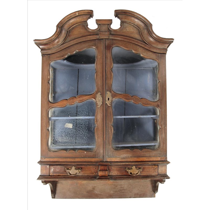 A Dutch walnut hanging display cupboard, with a pair of glazed doors enclosing shelves and two drawers above a long drawer, with parquetry spandrels, late 18th / early 19th century, 47½in (120.6cm) high, 33in (83.7cm) wide, 12¾in (32.5cm) deep.