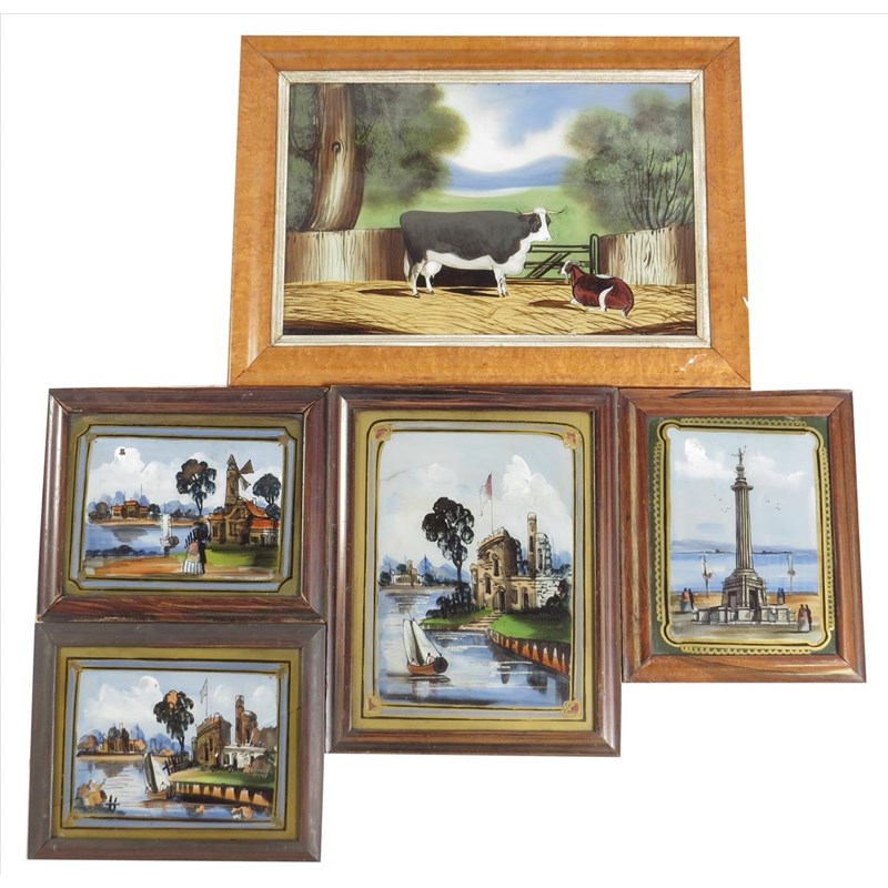 Five Victorian reverse painted glass pictures, including a view of Nelson's Monument, Yarmouth, Norfolk, a view of Pembroke Castle, two landscape views and one of cattle, 14½ x 22¼ (36.7 x 56.4cm), all framed. (5)