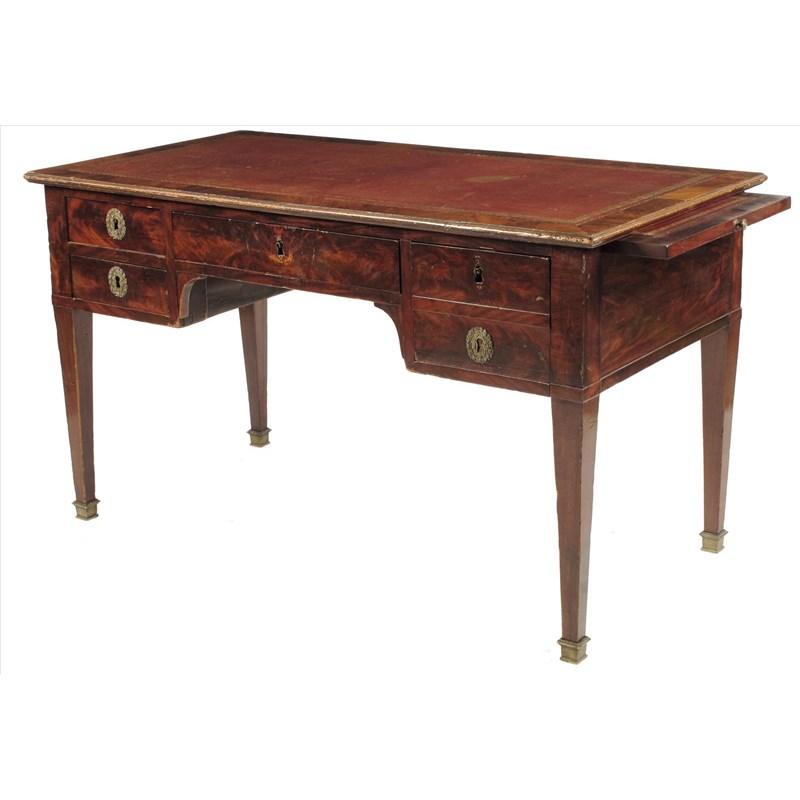 A 19th century French mahogany writing table, with a replaced red leather writing surface, above four frieze drawers, one a deep drawer with a false front, on square tapering legs and brass caps, 29¾in (75.3cm) high, 51½in (130.6cm) wide, 26in (66cm) deep.