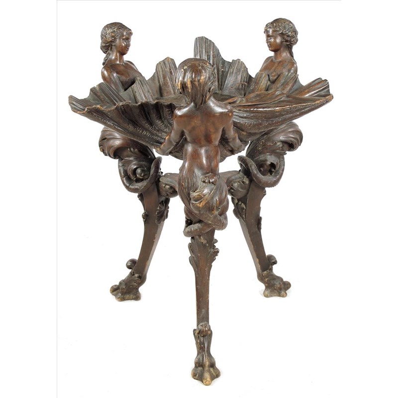 A late 19th century Italian carved and stained wood tripod basin by Vincenzo Cadorin, the shell bowl with a circular aperture and plaster interior, supported by two mermaids and a merman, united by a triform stretcher shelf on scroll legs to leaf and talon feet, signed 'V. CADORIN : VENEZIA', 36½in (92.6cm) high, 28½in (72.5cm) wide, 26in (66cm) deep.