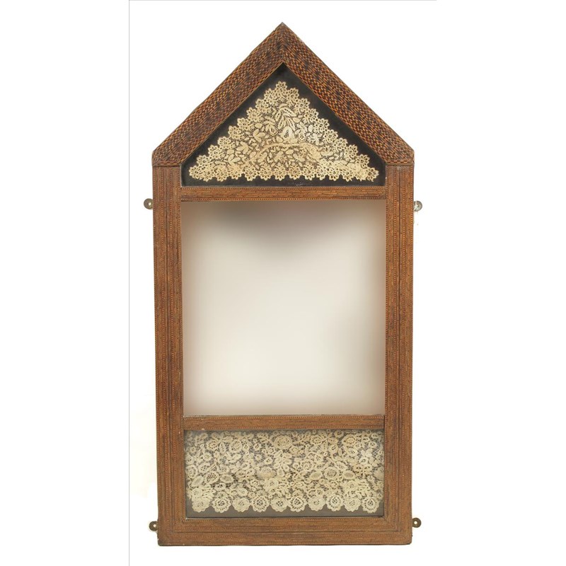 A continental parquetry frame mirror, inset two lace panels, 19th century, possibly Italian, 45¾ x 22½in (116 x 57cm).