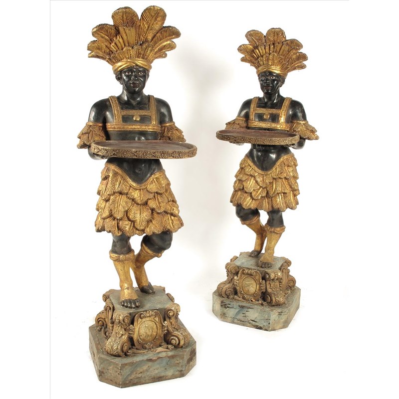 A pair of carved wood and parcel gilt Blackamoors in 18th century style, each supporting an oval tray and wearing a plumed headdress, arm bands and a skirt, on a stepped base, with vacant cartouches, 61in (155cm) high. (2)