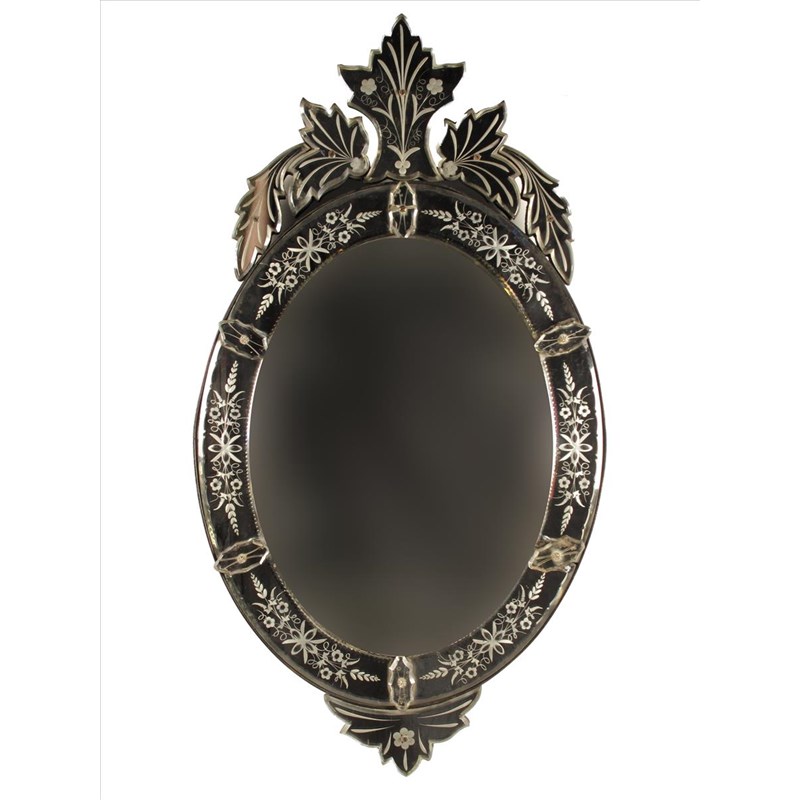 A Venetian oval wall mirror, with etched surmount and border, early 20th century, 38 x 20½in (96.5 x 52cm).