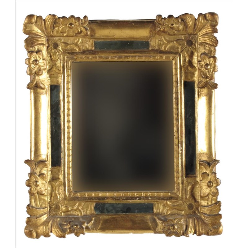 An Italian giltwood and gesso wall mirror, with a replaced rectangular plate, 16½ x 14½in (42 x 37cm).