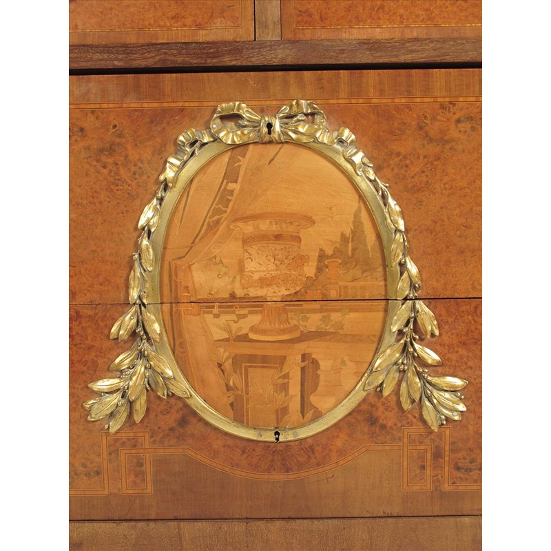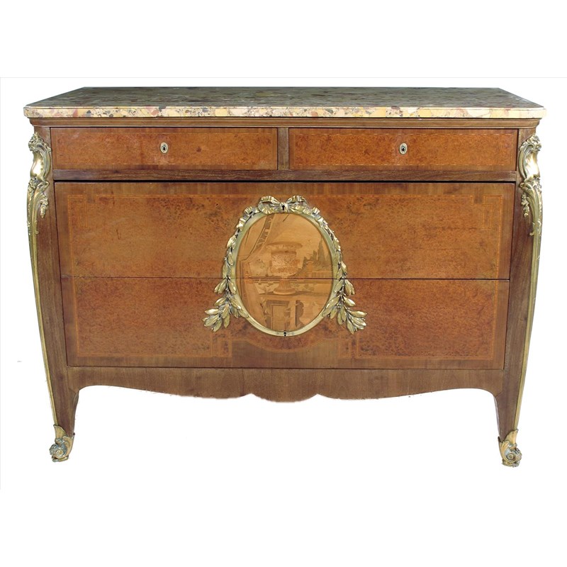 A late 19th century French amboyna, mahogany and marquetry commode, with ormolu mounts, the moulded edge brêche d'alep above two frieze drawers and two long drawers inlaid an oval panel, with urns in a garden within a ribbon tied laurel frame, 49in (124.5cm) wide, 24½in (62cm) deep.