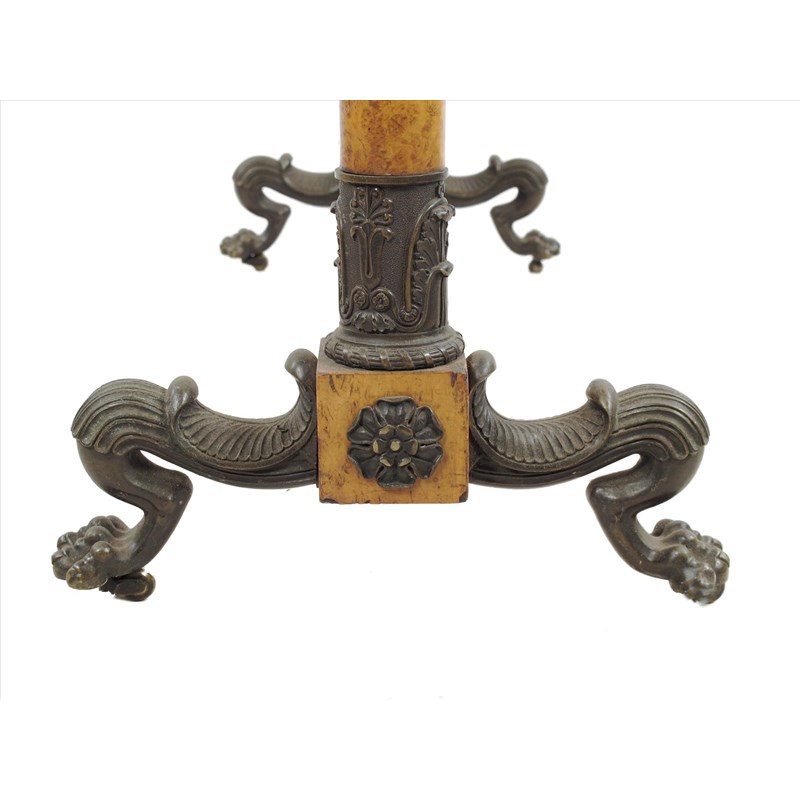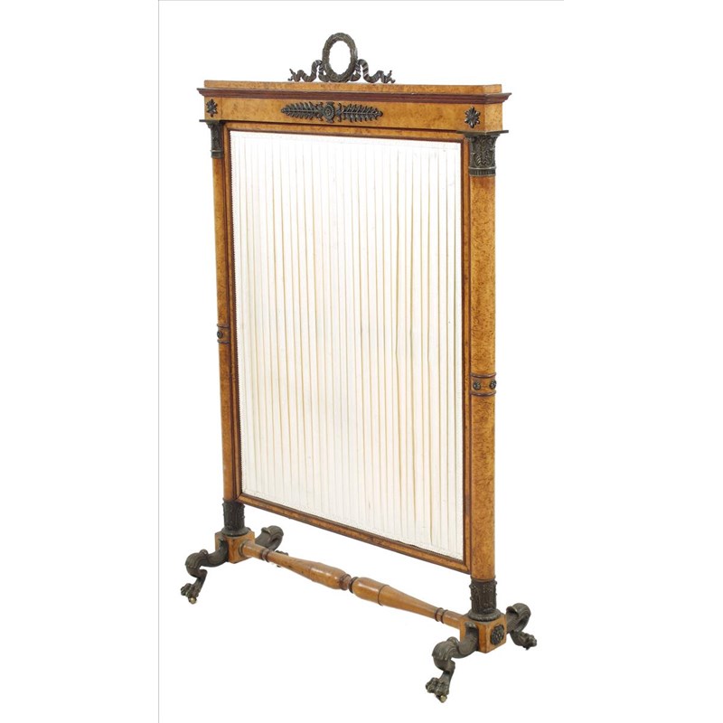 A Louis Phillipe burr walnut, purpleheart and bronze mounted firescreen, with a ribbon tied laurel wreath handle, above a pleated panel flanked by Corinthian capital columns on paw feet and brass roller castors, 43in (108.8cm) high, 27¼in (69.1cm) wide, 10¼in (26cm) deep.