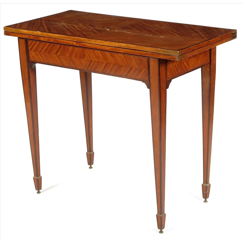 A 19th century French satinwood card table, with stringing and banding, the reverse with pull-out drawer supports, 29¾in (75.5cm) high, 34in (86.3cm) wide, 16¾in (42.5) deep.