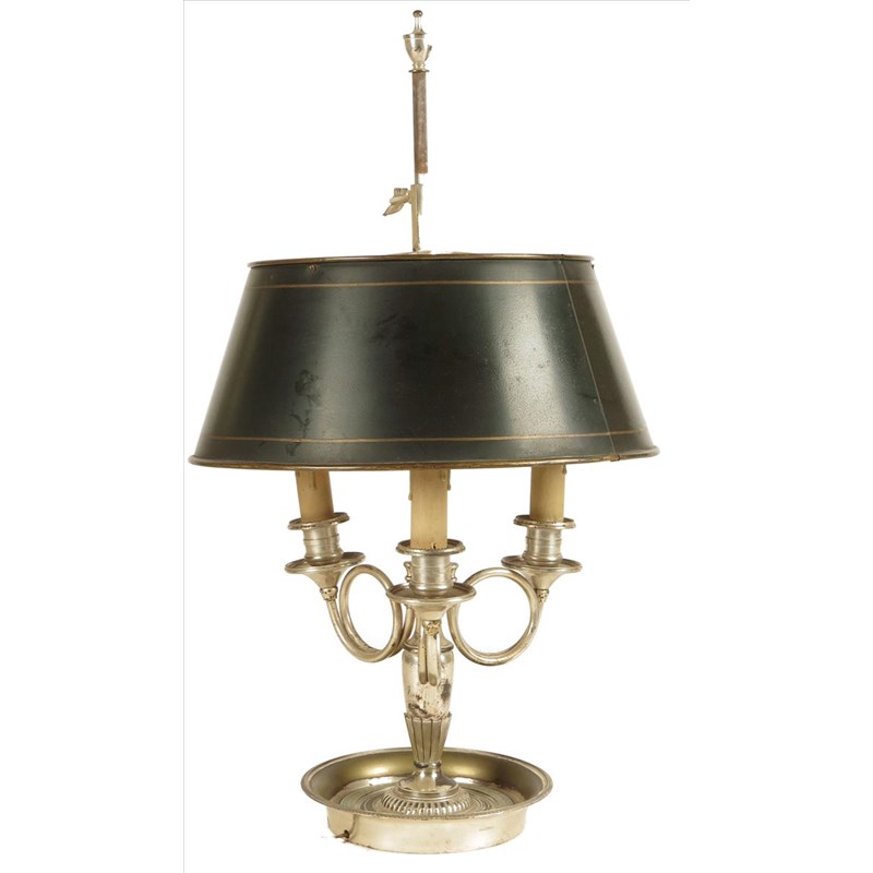 A silvered brass bouillotte lamp, with three branches and a tôle adjustable shade, 22½in (57cm) high.