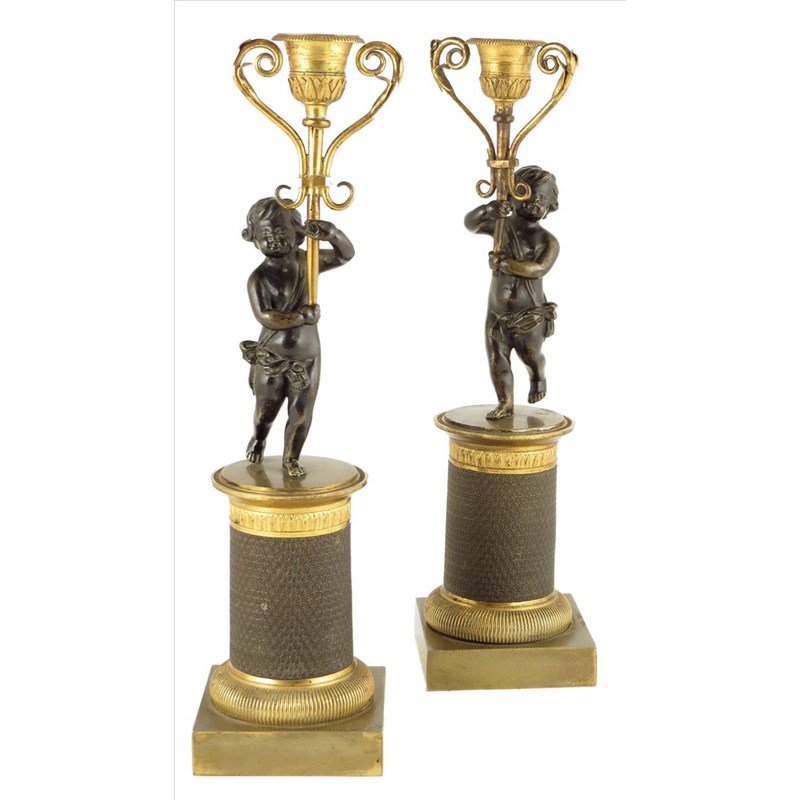 A pair of Empire bronze and ormolu candlesticks, with putti supports, 12½in (32cm) high. (2)