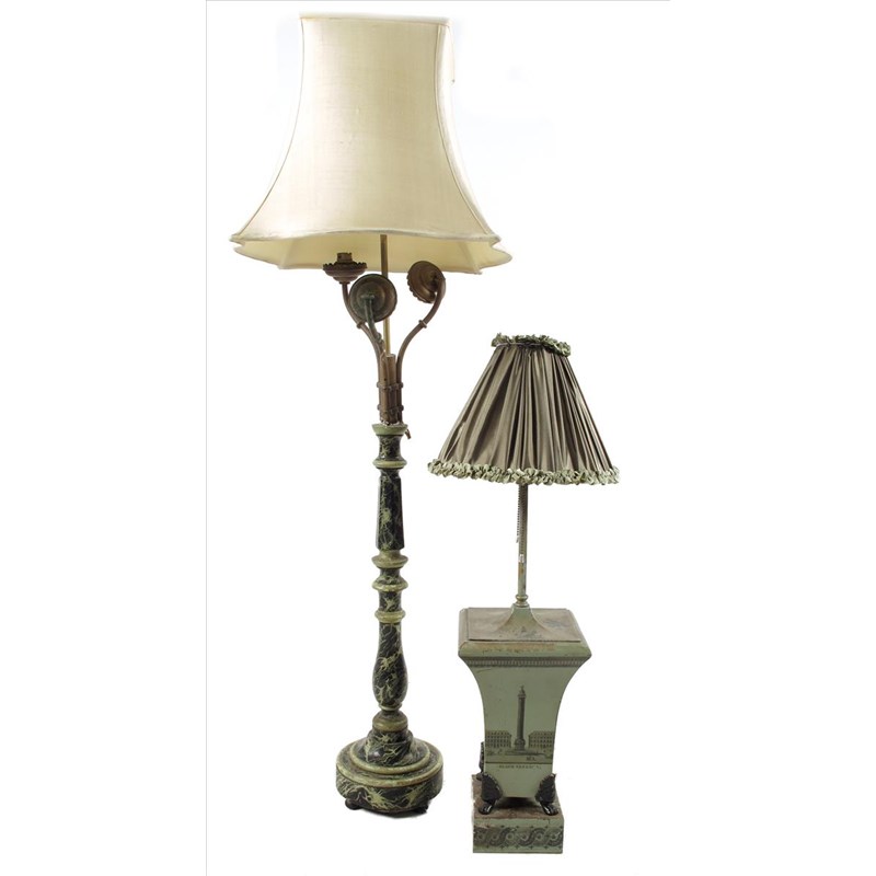 A French painted and printed brass lamp, decorated 'PLACE VENDOME', Wellington and Napoleon, with a twin fitting, 27¼in (69.3cm) high, with shade and a wood faux marble painted lamp with brass triple light fitting, 49in (124.5cm) high, with shade. (4)