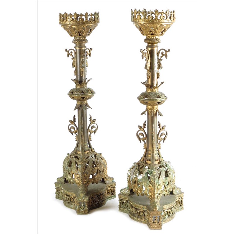 A pair of late 19th century French gilt brass candlesticks, with beast head, wing, floral and bead decoration, 24¼in (61.4cm) high. (2)