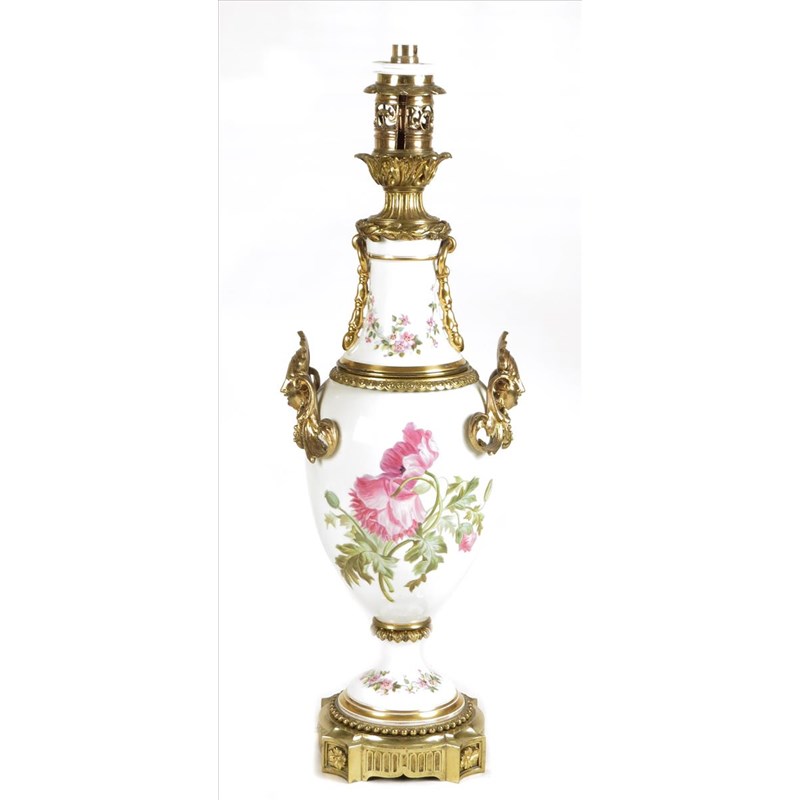 A continental porcelain and ormolu mounted table lamp, with floral painted decoration, 27¾in (70.5cm) high.