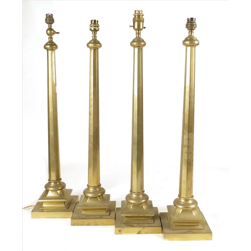 A matched set of four brass table lamps, with faceted stems on square bases, one with a horn switch, 28½in (72.5cm) high. (4)