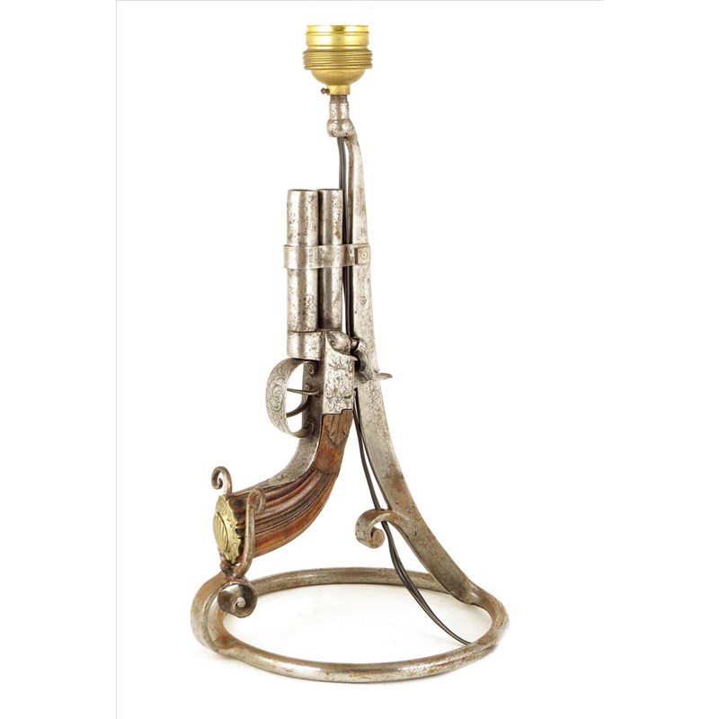 A continental polished steel lamp, mounted a double barrel flintlock pistol, 13¾in (35cm) high.