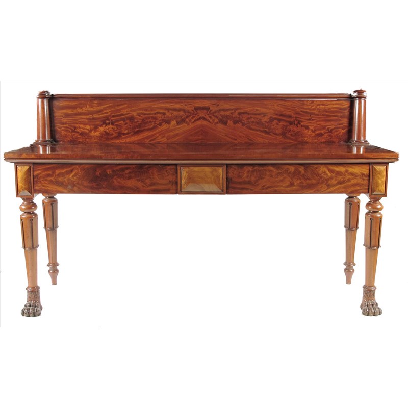 A Victorian Scottish mahogany serving table, with two frieze ash lined drawers on lappet carved legs to carved front paw feet, 49in (124.7cm) high, 82½in (209.5cm) wide, 24½in (62cm) deep.