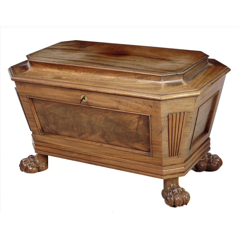 A late Regency mahogany sarcophagus shape wine cooler, the interior later fitted a Collaro record player, on carved paw feet and castors, 20½in (52cm) high, 34in (86.3cm) wide, 20¾in (52.5cm) deep.