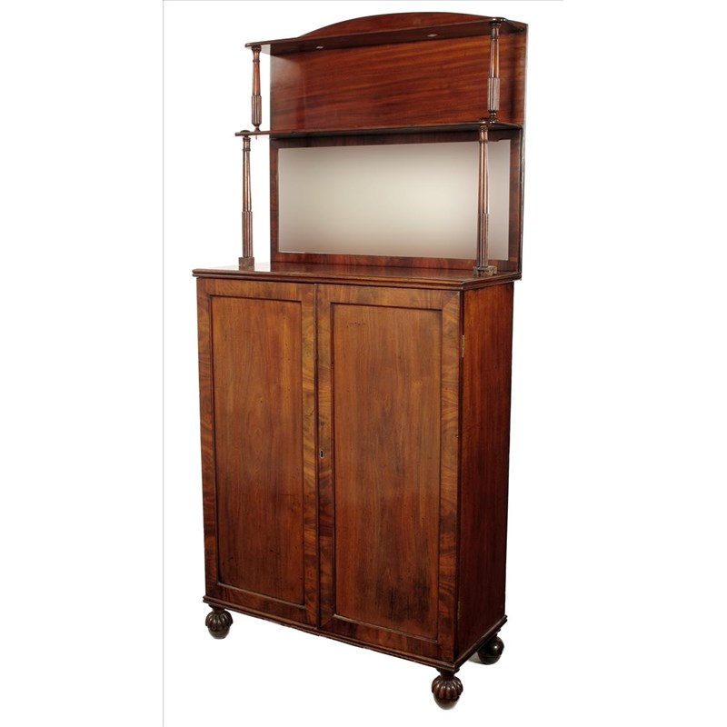 A George IV mahogany side cabinet, with a raised mirror back, the base with three adjustable shelves, 41½in (105cm) high excluding back, 31½in (79.6cm) wide, 13¾in (35cm) deep.
