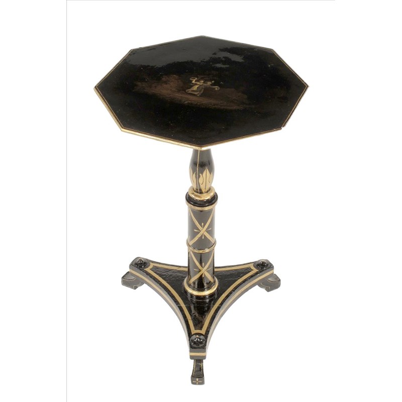 An ebonised and parcel gilt painted tripod table, with an octagonal top painted two children in a country landscape, 21in (53.3cm) high, 13in (33cm) wide.