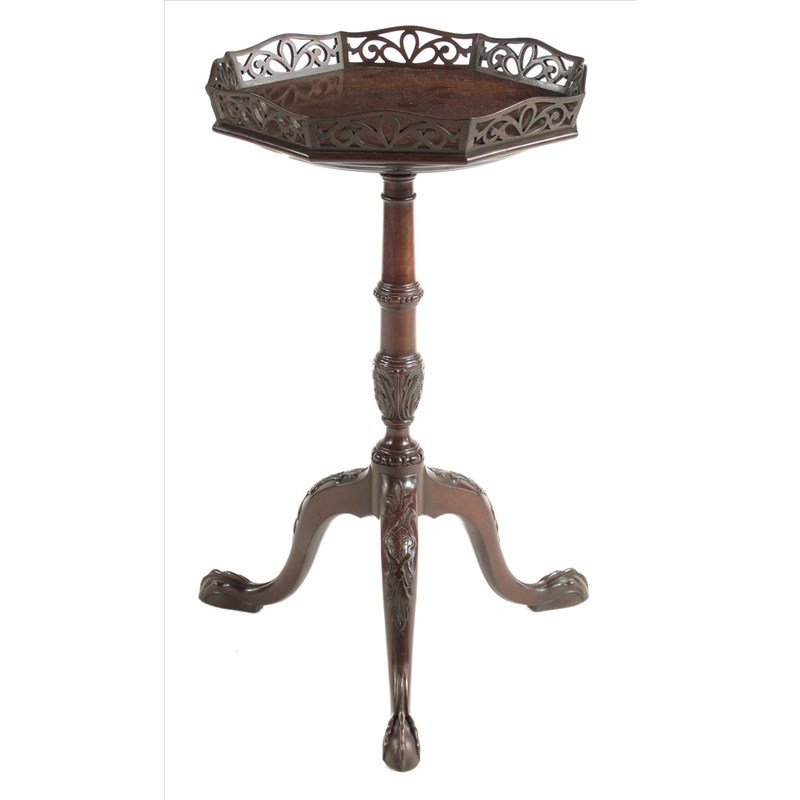 A mahogany tripod table in mid 18th century style, the octagonal top with a pierced gallery on a leaf carved stem and legs, late 19th / early 20th century, 27in (68.5cm) high, 19in (48.3cm) wide.
