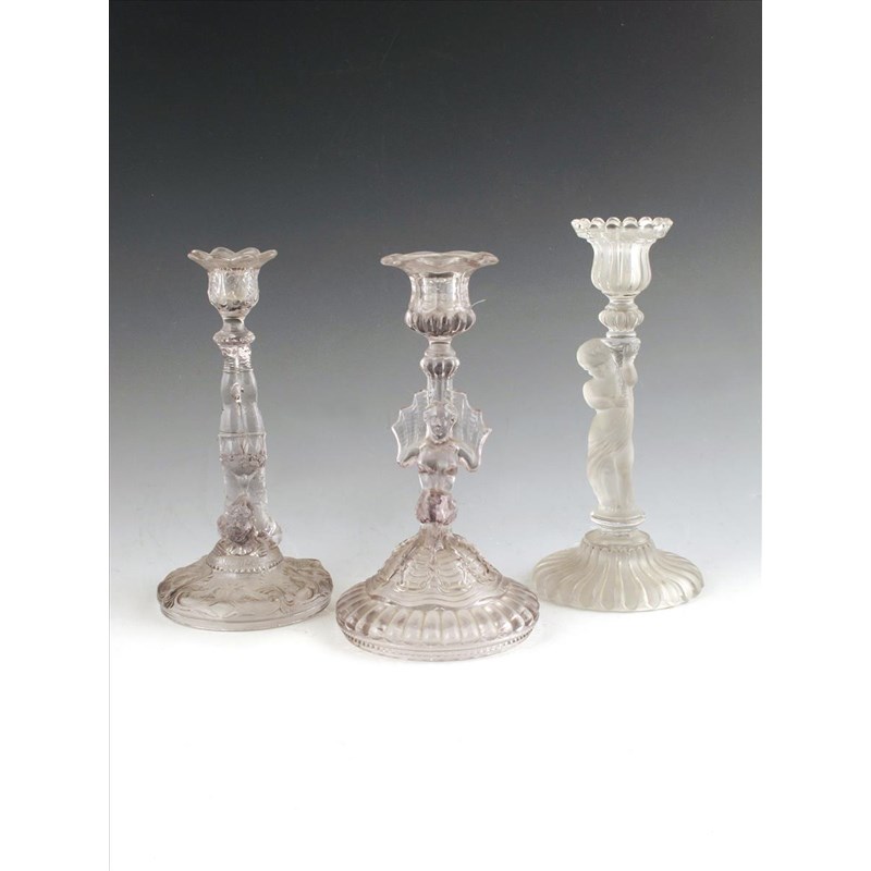 A Baccarat glass figural candlestick, modelled with a cherub holding a torch, the base with moulded mark 'BACCARAT', 20th century, 10in (25.2cm) high, together with two Portieux moulded glass figural candlesticks, one with a mermaid stem, the other with an acrobatic harlequin figure, both marked 'PORTIEUX'. (3)