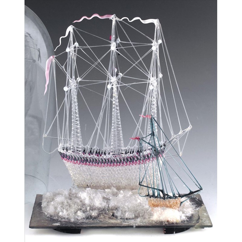 A Victorian Nailsea glass frigger in the form of a three masted ship, with crew and another vessel, under a glass dome, 15¼in (38.7cm) high, 11½ (29.3cm) wide.