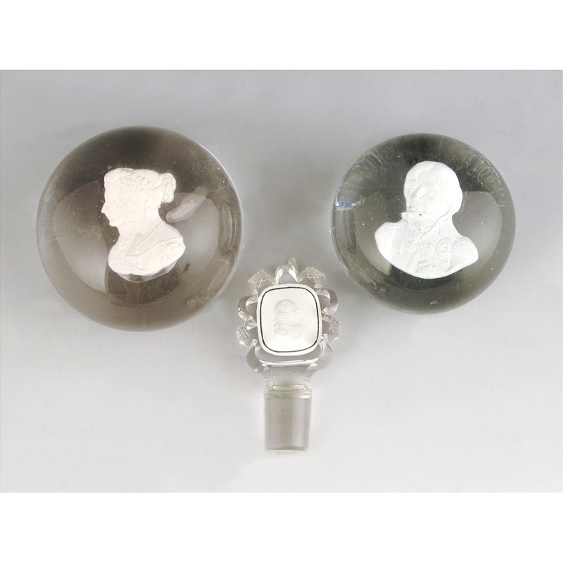 A 19th century glass paperweight with a sulphide double portrait of Queen Victoria and Albert, possibly Clichy, 3in (7.3cm) wide, together with a similar paperweight with a sulphide portrait bust of Nelson, 2¾in (6.7cm) wide and a cut glass decanter stopper with a profile bust of George III, the reverse with the death of Wolfe, inscribed 'Marchant Inv F', 2¾in (6.9cm) high. (3)