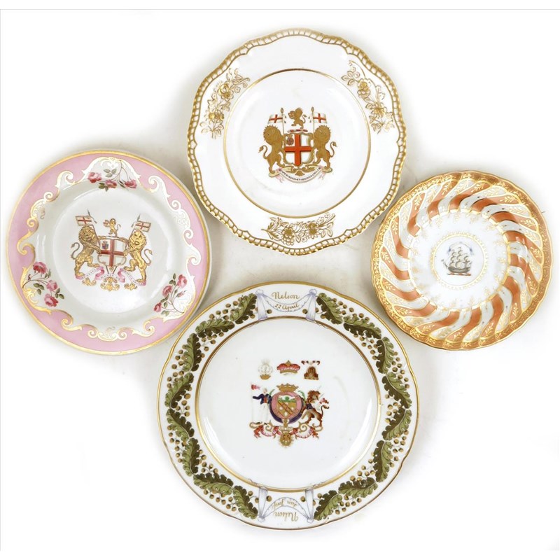 An early 19th century Flight, Barr & Barr Worcester porcelain armorial plate, decorated with the arms of the New East India Company and the motto 'AUSPICIO REGIS ET SENATUS ANGLIAE', printed and impressed marks, 9¾in (24.7cm) diameter, a Spode felspar porcelain armorial plate, also with the arms and motto of the New East India Company, printed puce marks and 'THE LONDON', a Chamberlain's Worcester porcelain plate, the centre decorated Admiral Duncan's family crest with the motto 'DISCE PATI', puce mark and a Samson porcelain charger in the 'Nelson Service' pattern, early 20th century. (4)