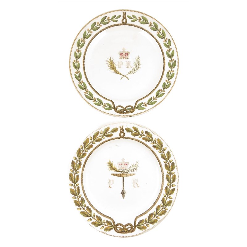 Two early 19th century Spode china crested plates for use on the Royal George, from the yacht service made for the Prince Regent, decorated with the Royal cypher and an anchor, one plate has an oak and acorn border, the other with a laurel border, iron red Spode marks to underside, 9¾in (24.5cm) diameter. (2)