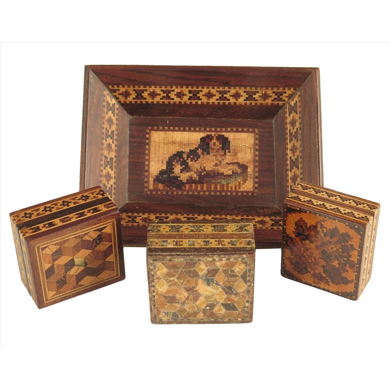 ‡A Victorian Tunbridge ware and rosewood small tray, decorated a recumbent spaniel, 3¼ x 4¼in (8 x 10.7cm), together with three stamp boxes, two with specimen wood parquetry cube lids, the other with a floral panel. (4)