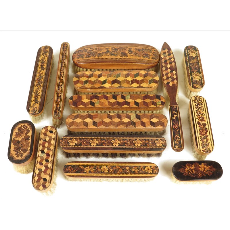 Fourteen Victorian Tunbridge ware brushes, the smallest attributed to Thomas Barton, the handles decorated with specimen wood parquetry cubes and floral designs, 9½in (24cm) long, max. (14)