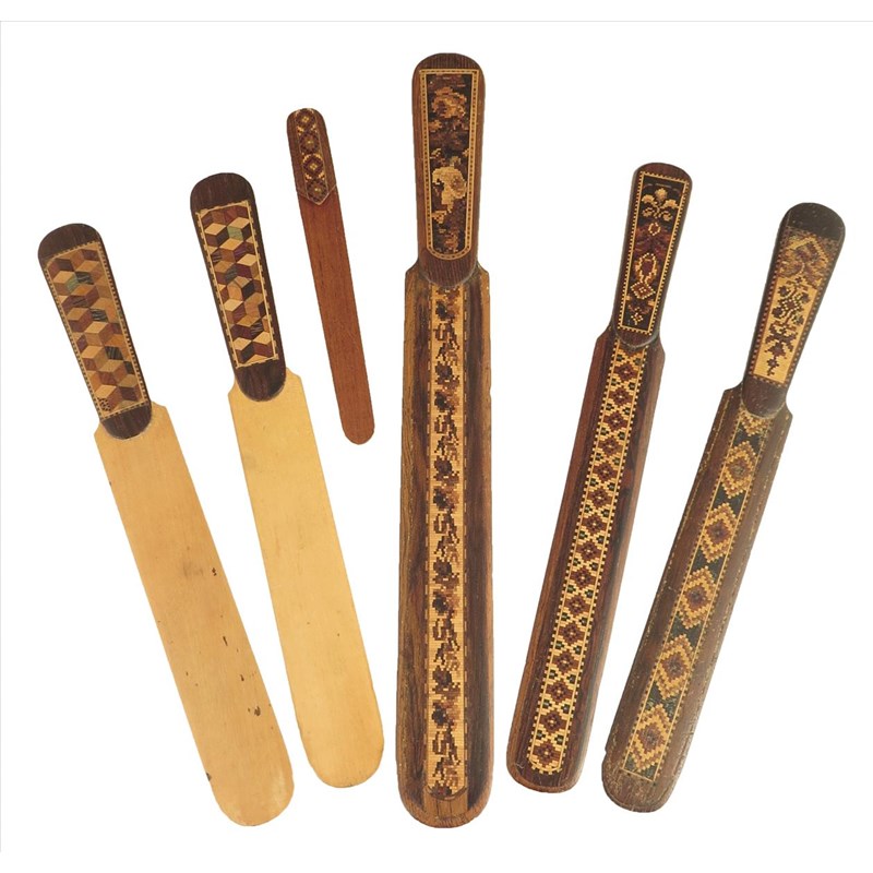 Five Victorian Tunbridge ware page turners, the largest attributed to Thomas Barton, three all over decorated with a combination of specimen wood parquetry, geometric and floral designs, together with a bookmark, 12¼ (31cm) long, max. (6)
