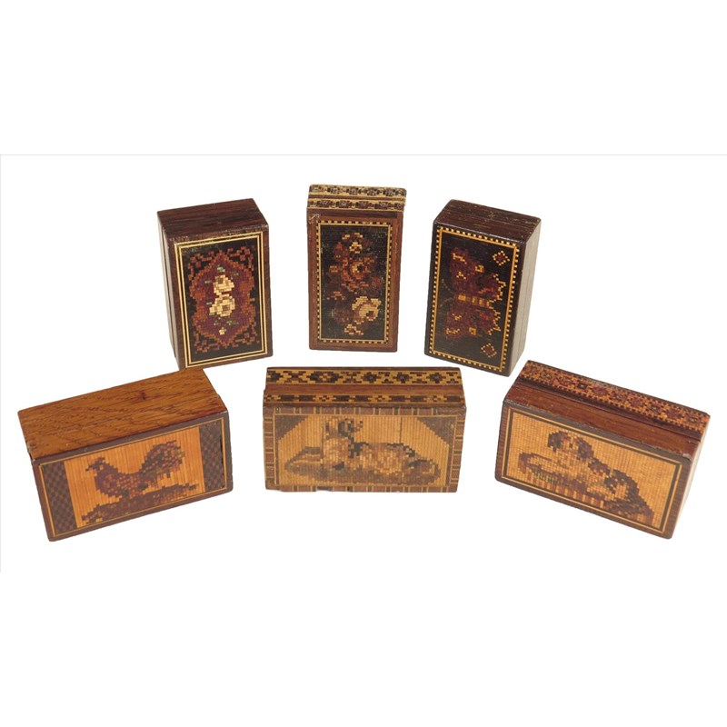 Six Victorian Tunbridge stickware small rectangular boxes