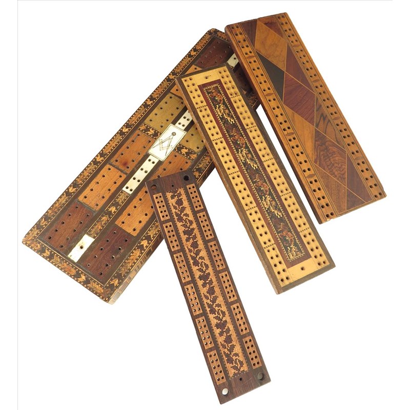 ‡Four Victorian Tunbridge ware cribbage boards, comprising: a Masonic board, with specimen woods, bone and ivory, engraved with a square and compass, on brass feet, with a plug hole to store pegs,12½in (31.4cm) long, a rosewood board, a specimen wood board and a board with a peg recess with a sliding cover. (4)