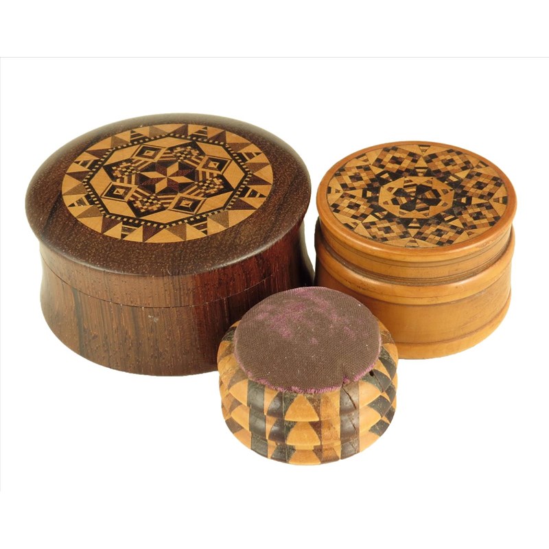 ‡A Victorian Tunbridge ware and rosewood circular box and cover by Thomas Barton, the interior with a zinc lining the base with the remains of a paper label, 3in (7.7cm) diameter, a very rare boxwood box and cover, with stickware decoration and a stickwork pin cushion. (3)