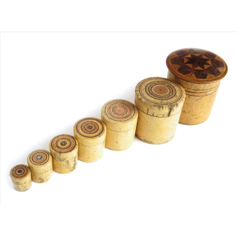 A rare early 19th century Tunbridge ware whitewood nest of seven lidded containers attributed to Edmund Nye, the largest inlaid a parquetry star, the others painted with radiating designs, 1¼ (2.7cm) high, 1in (2.5cm) wide, max.