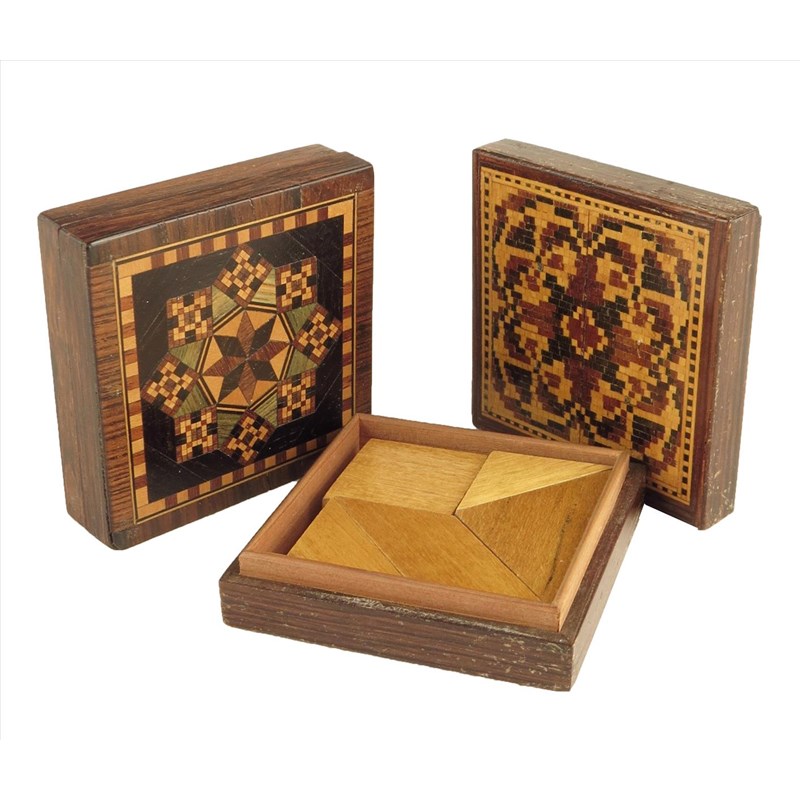 ‡A Victorian Tunbridge ware rosewood tangram puzzle box, the lid decorated with a mosaic flower head, the interior with a puzzle, 2in (5cm) wide, together with another tangram puzzle box by Thomas Barton, the inside of the parquetry star lid with a printed paper label inscribed 'T. BARTON late NYE, Manufacturer, MOUNT EPHRAIM and PARADE, TUNBRIDGE WELLS'. (2)