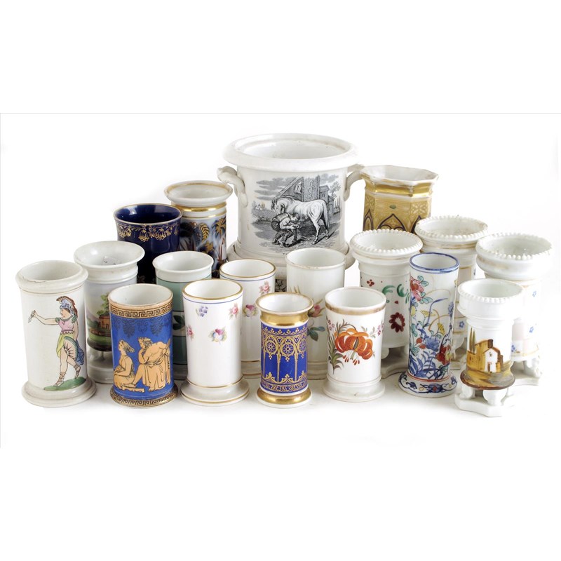 A collection of seventeen ceramic spill vases, including a pair by Copeland, 19th century and later, 6¾in (17.3cm) high, max. together with a 19th century pearlware urn on stand decorated with 'THE AILING FOOT', 7¾in (19.4cm) high. (19)