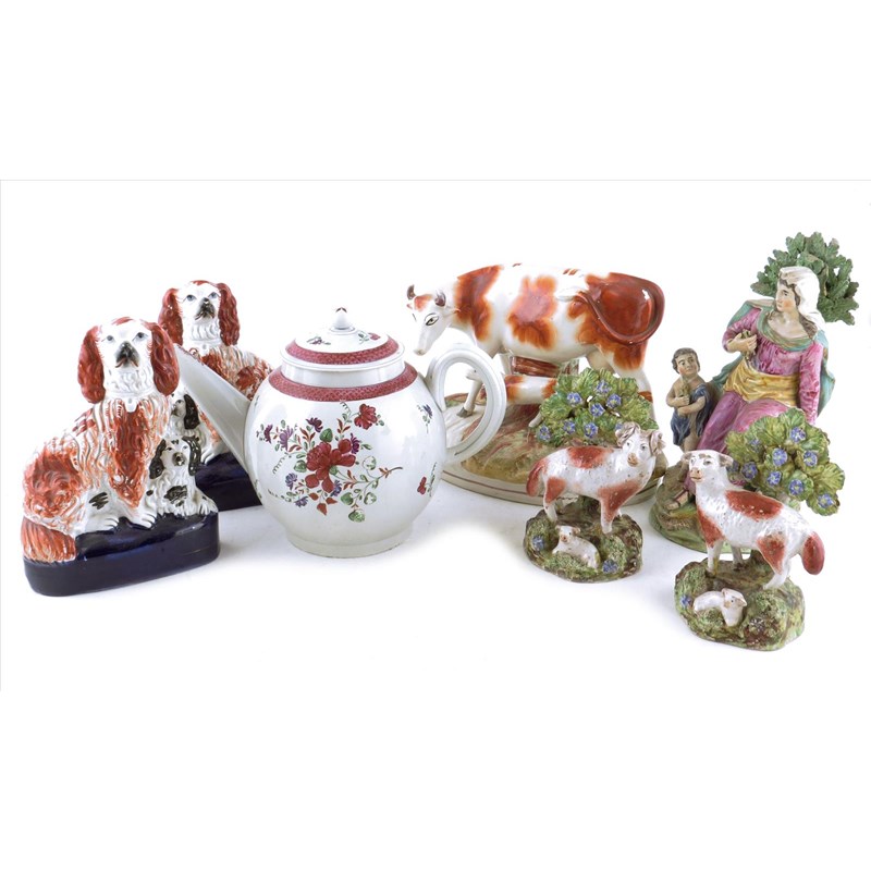 A 19th century pearlware teapot and cover, with painted floral decoration, 7½in (19cm) high, a pair of Staffordshire twin spaniel groups, 8in (20cm) high, a Staffordshire cow and calf group, and a pair of Walton pearlware ram, ewe and lamb groups, 6in (15.2cm) high, and a Staffordshire group of a seated lady with putti, 9½in (24cm) high. (7)