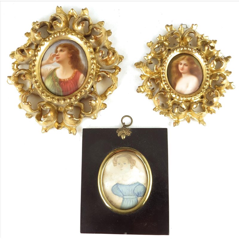 A Hutschenreuther oval porcelain plaque, painted a young lady, with HR in circle mark and '15', 3¼ x 2¾in (8.5 x 6.7cm) in an Italian giltwood frame, a German porcelain plaque of a naked young lady, the reverse with label inscribed 'Ov. 22 Solitude,' 2½ x 2in (6.2 x 5.2cm) in an Italian giltwood frame and a 19th century Naive School portrait miniature of a young girl, watercolour, in an ebonised frame. (3)