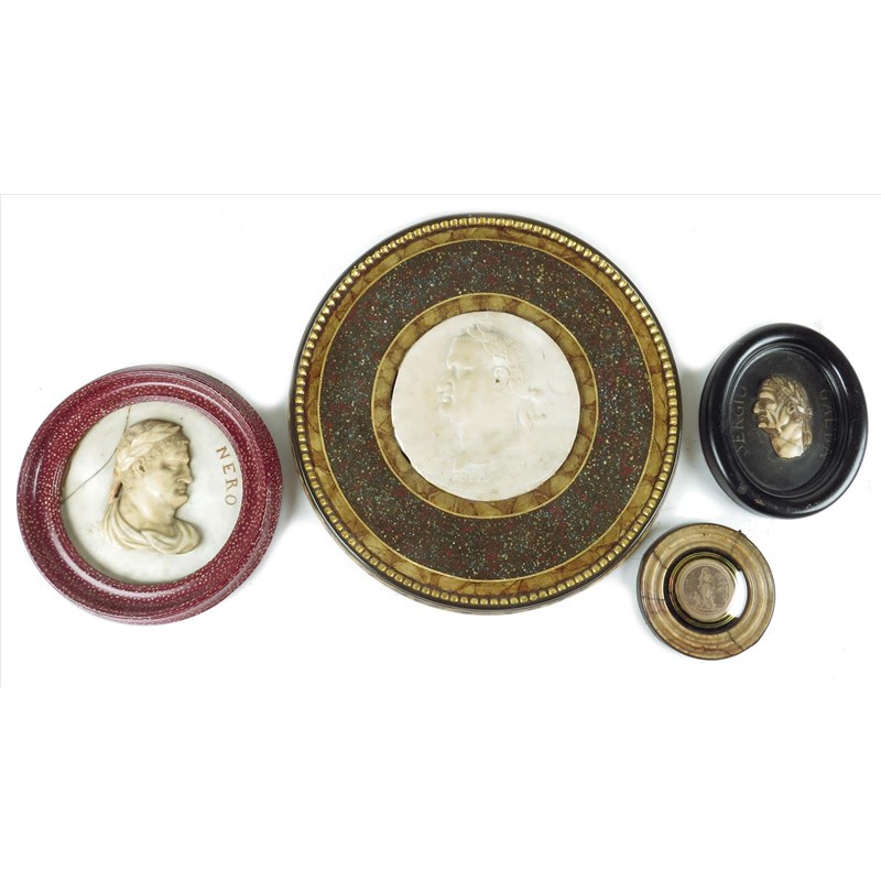Three Italian Grand Tour carved marble profile relief busts of Roman emperors, titled 'SERGIO GALBA', 'NERO' and 'VESPAS AUG', in painted wood frames, 13¾in (34.8cm) diameter, together with a classical engraving within a moulded marble frame, 19th century and later. (4)