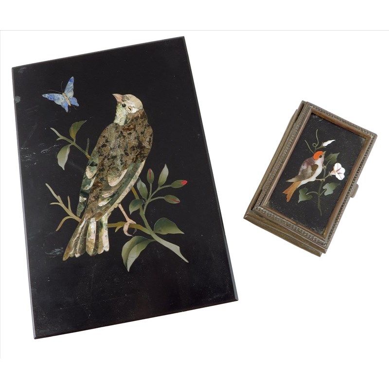 A late 19th century ornithological pietra dura panel, 7½in (5cm) high, 19in (12.6cm) wide, and a small brass box similar inset pietra dura lid, 1½in (3.8cm) high, 3½in (8.5cm) wide. (2)