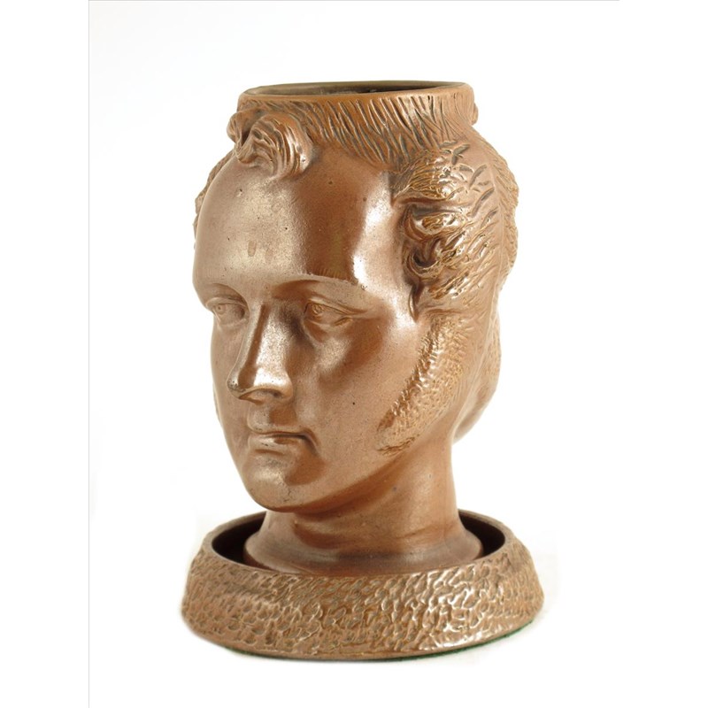 A Victorian pottery janus head jar on stand, modelled with a portrait bust of Prince Albert, 9in (22.5cm) high, 7in (17.7cm) wide. (2)